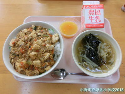 マーボー丼とわかめスープ,みかんゼリー,牛乳でした。