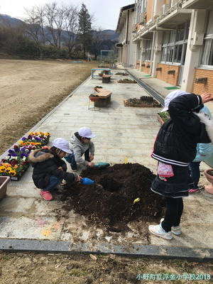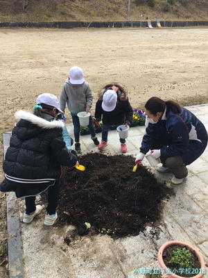 用務員さんが戻ってくると,虫探しの土掘りからパンジーのための土入れに活動が変わりました。