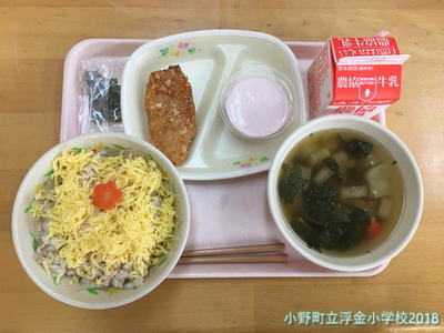 メニューは、「洋風ちらしずし」「牛乳」「ささみフライ」「大根スープ」「手作りいちごババロア」です。
