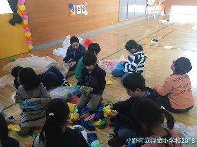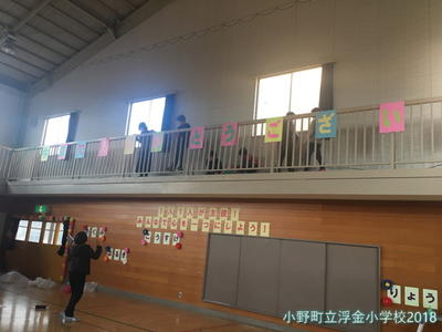 3年生から5年生が協力して明日の卒業を祝う会と鼓笛移杖式の会場を飾りました。