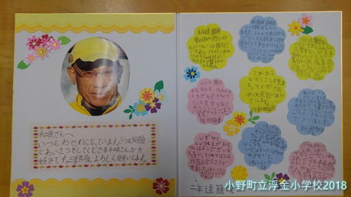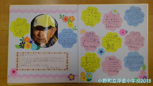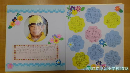 今朝は気温も低く風もありましたので、大変寒く感じしました。子どもたちは、いつものように見守り隊の方と一緒に元気に登校しました。いつもと違ったのは、お世話になっている見守り隊の方に、全校児童で書いた色紙を渡し感謝の気持ちを表したことです。