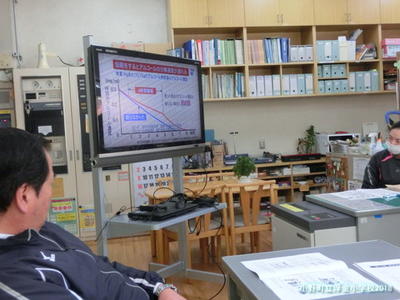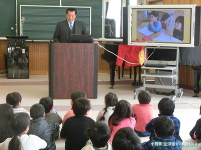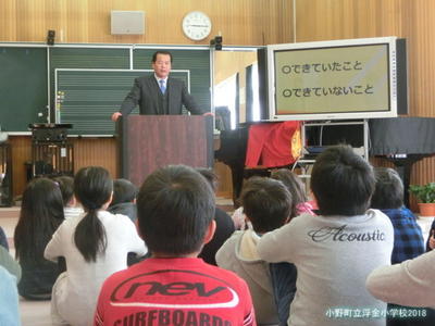 次に、毎日の登校について校長からお話しました。登校時には、見守り隊の方が後ろに必ず付いて歩いてくださいます。ところが、子どもたちの行動を見ていると肝心な態度が見られないのです。「おはようございます」は元気にできているのですが・・・。それに気づかせるために登校時の映像を子どもたちに見せました。答えは与えず、一人一人考え明日からの行動で示すこととしました。