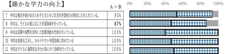 ○質問8の肯定的回答の割合が87%である。確実な学習内容の理解のために,授業改善や家庭学習の充実と併せて,個人差に応じた具体的な指導,継続的な指導などの工夫が求められている。
