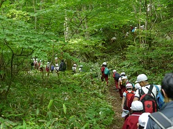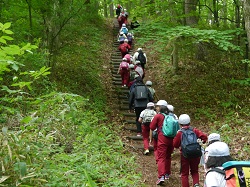 頂上までもう少し。縦割り班ごとに1列になって歩きます。