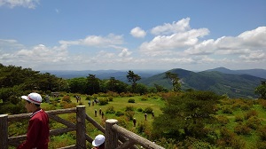頂上では、青空と白い雲がとてもきれいでした。子どもたちは、登りのつらさを忘れ自然の中を走り回っていました。