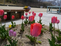 校舎の南側には3組のベンチと花壇があります。冬の時期は何もなくさびしかったのですが、4月にはチューリップが咲きそろいました。