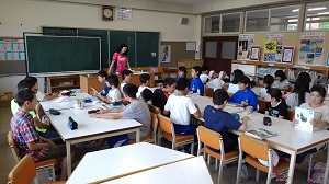 まず体育館で、仲間作りができるゲームを楽しみました。大きな歓声が飛び交いとても明るい雰囲気の時間でした。次は、A組・B組・C組に分かれ、それぞれに授業が行われました。浮金小の6名は2名ずつに分かれ、大人数の中での授業体験です。緊張したのか言葉数が少ない子もいれば、いつもと変わらず話し合える子もいたようです。