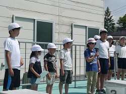予定を変更し、6月7日(木)にプール開きを行いました。1週間ほど早めたのでプールの水がまだ満水になっていない状態での会となりました。各学年の代表児童が今シーズンの水泳学習の目標を発表しました。泳ぎ方に力を入れる子、泳ぐ距離やタイムにこだわる子というように、一人一人が自分の目標を具体的にもつことができていました。