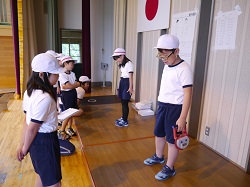今日の午前中に全校生で新体力テストを実施しました。小雨が降っていたので、握力・長座体前屈・上体起こし・反復横跳び・立ち幅跳び・20mシャトルランの6種目を行いました。下学年の子どもたちが分かるように高学年児童がてきぱきと動いていました。さて、本校の体力はどうなのかな?