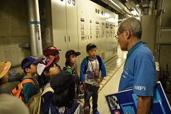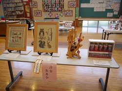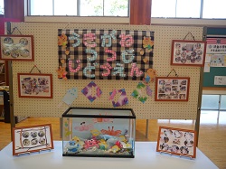 学習発表会当日は各種団体から作品展示のご協力もいただきました。俳句などの文芸作品から、華道や五円玉作品、お母さんたちのおしゃれなフォトフレームや児童園の可愛らしい海の生き物の作品など、様々な展示をしていただきました。消防団の方々には活動紹介のスライドショーを準備していただいたり、実際にポンプ車に乗せてせていただいて説明をしてもらったりと、普段はできない体験をさせていただきました。