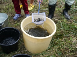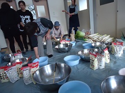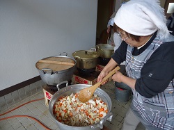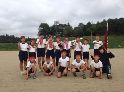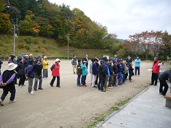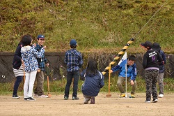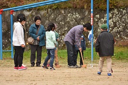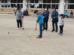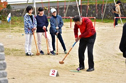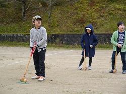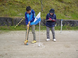 おいしい豚汁うどんをいただき、お腹が満たされた後は、グランドゴルフ協会の方にご協力いただき、グランドゴルフ大会を開催しました。昨年度、今年度でだいぶグランドゴルフに親しんできた子どもたち、今回も1位を目指して熱い闘いを繰り広げていました。