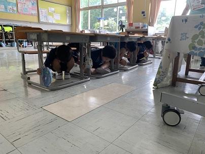 授業中の訓練に、おどろいた児童もみられましたが、すぐに状況を理解し、放送に合わせて自分の身を守る3つの行動をとりました。