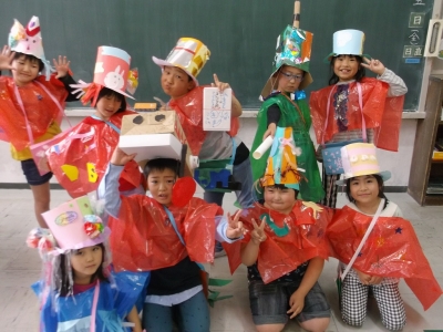 図工の時間に、服とカバンをつくりました。前回つくった帽子をかぶって、すてきな衣装を身にまとい、校舎内を楽しそうに歩いていました。