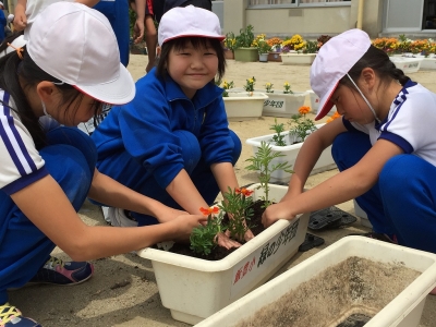 苗は、吉野辺地区の「ひまわり会」様からたくさんいただきました。ありがとうございました。校門下の花壇にもたくさん植えました。花が咲くのが楽しみです。