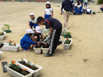 全校生が縦割り班に分かれ、上級生のリーダーシップのもと、協力しながらマリーゴールドの苗植えをしました。