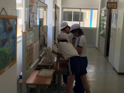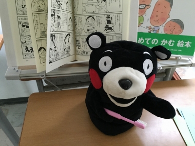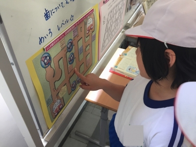 東昇降口に歯に関する本を置いたり、クイズを掲示したりしました。食後の歯みがきや食べ物をかむ回数など、歯・口に関する日常的な習慣を見直す機会になればと思っています。