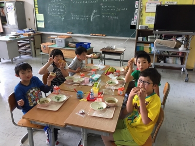 自分で、パンにハンバーグとチーズを入れ、ソースをかけてはさみ、“自家製ハンバーガー”をつくって、楽しみながらおいしそうに食べていました。