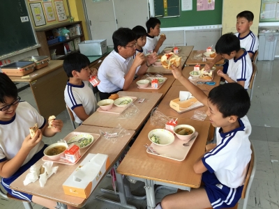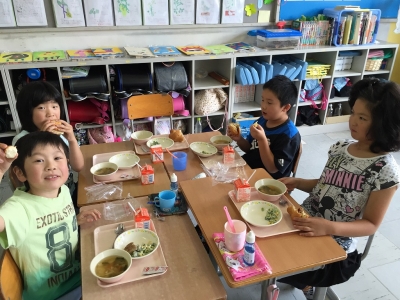 今日の給食は、セルフサンドパン、ワンタンスープ、枝豆サラダ、牛乳でした。