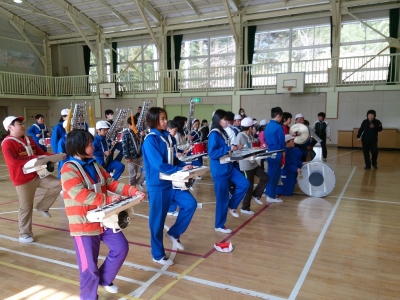 6年生のアドバイスを受けながら、校歌とドラムマーチの練習をしました。