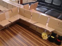 職員玄関の前に、この形をした段ボールのパーツをたくさん置いています。