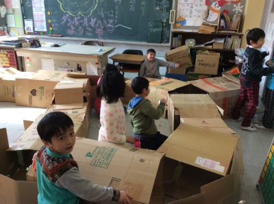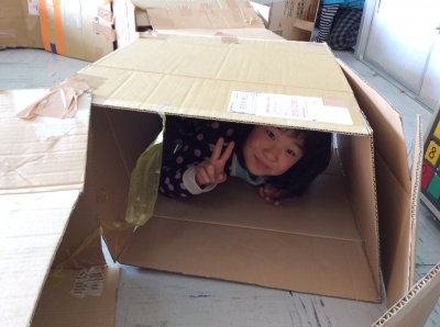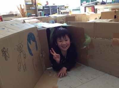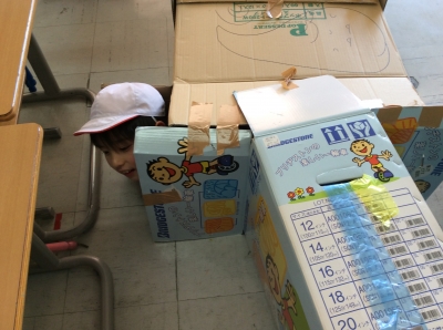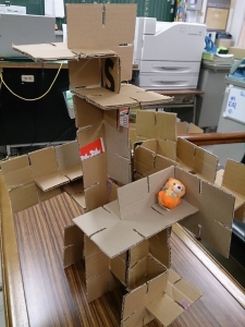 本日、2年生は図工の授業で、段ボールをつなげて巨大迷路をつくりました。