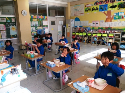 先日、給食の時間に、給食や食べ物に関するクイズを出しました。