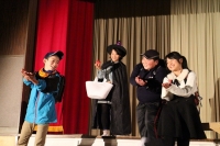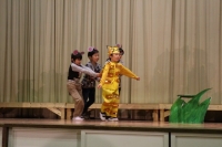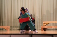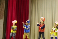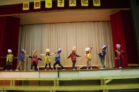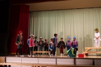 なおと君が玉手箱を開けておじいさんになってしまい、彼を助けようと友達が奮闘する内容の劇でした。たくさんの流行のギャグが盛り込まれ、観客は大笑い。一人一人の声も大きく、役になりきった演技は素晴らしいものでした。