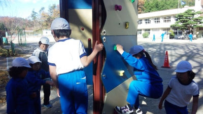 新しい形のシャングルジムです。交互に組み合わされた棒にのぼって楽しみます。写真に写っている2年生もにっこりです。