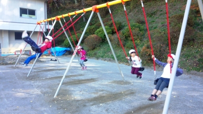 従来のチェーンのブランコではなく、ワイヤーロープのブランコとなりました。子ども達に大人気の遊具です。高い位置までこいで楽しんでいました。
