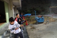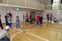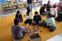 子どもたちは縦割り班をつくって、ほぼ半分の遊びに約30分ずつ取り組みました。子どもたちは、おじいさんたちにやり方を教わり、見よう見まねで挑戦していました。お父さんお母さんたちにも昔からの遊びには慣れていない方が多く、子どもたちといっしょに挑戦していました。