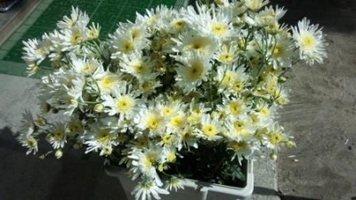先週金曜日、いつもお花をいただいています、リン子ばあちゃんから菊のお花をいただきました。花の中央が黄色で鮮やかな白の花びらの菊です。
