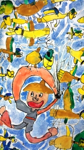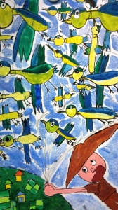 3年生は、昔話「かもとりごんべえ」を題材に、ごんべえさんが99羽のかもに引っ張られて空を飛んでいる場面を描きました。