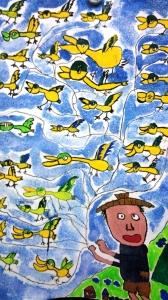 子ども達は、画面いっぱいにかもを描き、一羽一羽丁寧に色を塗りました。かもやごんべえさんをよく見ると、表情が様々で楽しさがとっても伝わってきます。