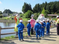 今日は、大方良次さんのご案内で、1・2・6年生が、三又地区で行われている「案山子展示会」を見にいってきました。