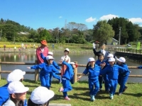 木には、たくさんのブルーベリーが実をつけていて、子ども達は、大きくて熟した実を夢中で収穫していました。摘み取っている途中、いくつかブルーベリーを口に・・・・。「おいしい!」という歓声を上げながら楽しい時間を過ごすことができました。