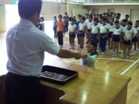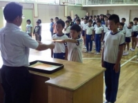 本日ののびのびタイムの様子です。まずはじめに、校内水泳記録会と夏休みの児童理科作品展の表彰が行われ、代表児童が校長先生から賞状をいただきました。