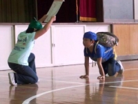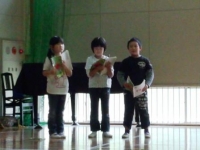次は、2年生による音読発表「お手紙」が披露されました。国語の教科書に載っている文章です。地の文、がまくん、かえるくん、かたつむりくんと役を分担し、会話文に気持ちを込めて大きな声で表現していました。