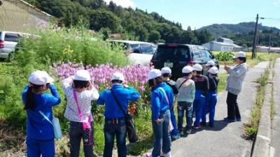 本日、3・4校時目に2年生は飯豊中地区へ地域探検にでかけました。子ども達は、周辺に咲いている草花の名前を言い当てながら歩きました。