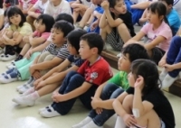 次に、本日で実習を終了する教育実習生からお別れの言葉がありました。「あっという間の1か月でした。この学校で実習をしてより一層教師になりたいという気持ちが強くなりました。これから大学に戻って私は勉強をがんばるので、みなさんも私に負けないぐらい勉強や運動をがんばってください」というお話でした。