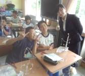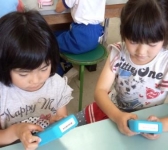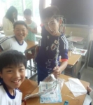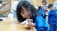 3校時目の授業では、まず、放射線は身近にあるものというお話がありました。放射線測定器「はかるくん」を使って、湯の花や塗料添加剤の放射線数値を測定しました。物質を近づけるとはかるくんの数値が上がり、子ども達は驚いていました。