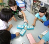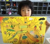 木の部屋、ジェットコースター、観覧車、空を飛べる雲、すべり台、お店やさんなど、様々なことを想像しながらのびのびと表現していました。夢が広がる楽しい作品ができました。