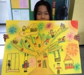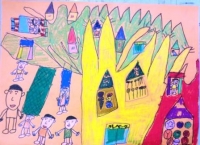3年生の図工では、「こんなことがあったら」という題材で絵を描きました。色画用紙の真ん中に大きな木を描き、「こんなことがあったらうれしいだろうな」「こんなことがあったらすごいな」というようなワクワク・ドキドキするような楽しいことを想像して絵を描きました。