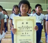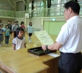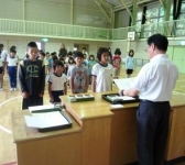 次に、全国小学生学年別柔道大会福島県予選会で見事第1位となった児童に、賞状が贈られました。この児童は、8月17日(日)に岩手県で行われる全国大会に出場します。ぜひ、上位入賞目指してがんばってほしいと思います。
