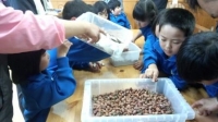 3~6年生は、東堂山からふれあいの森まで散策しました。“森の案内人”の方から、東堂山満福寺の歴史や数多くある羅漢像についての説明を聞きました。その後、森の中を歩き、植物の葉に関する話やイノシシが食べた球根の話、いいにおいがする葉っぱやリスがかじった松ぼっくりの話などを聞きながら楽しく歩きました。また、高学年はクラフト作りに使う、木の実や葉などを拾い集めながら向かいました。