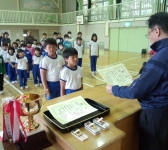 全校集会では、5月25日に行われた小野支部さいとう医院杯剣道大会の表彰も行いました。低学年・高学年のそれぞれの部で優勝した2名に賞状・メダル・カップが、団体戦で3位となった児童にメダルが校長先生から伝達されました。おめでとうございます。