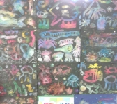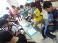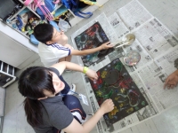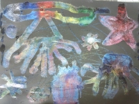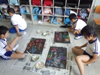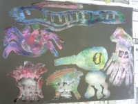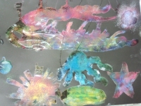洗濯のりを使って海の生き物を描き、スパッタリング用の金網でチョークの粉をふりかけて着色しました。子ども達は、様々な幻想的な不思議な色合いに心を躍らせながら夢中になって作品を仕上げていました。