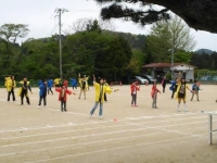1年生から6年生の全校生で「よさこいソーラン節」を元気一杯に踊ります。縦割りの清掃班ごとに隊列を作り、隊形を変えるところも見どころの一つとなっています。