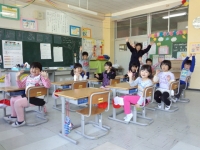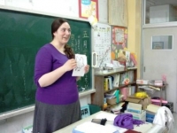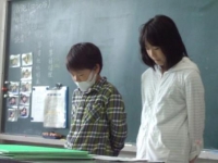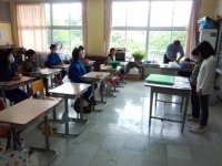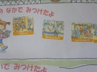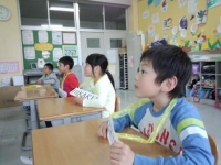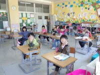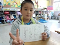 1年生の教室では、英語で動物の名前の言い方を練習していました。「ライオン」「犬」などの簡単なものだけでなく、「鯨」「蜘蛛」「クジャク」「たつのおとしご」など難しいものも練習していました。子ども達は、ケイティ先生の生の英語の発音を聞いて、上手にまねをしていました。