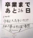 6年生教室の黒板に、卒業までのカウントダウン日めくりカレンダーが掲示されています。子ども達の手づくりのカレンダーには、格言や諺が書かれており、過去のものは廊下の掲示板に掲示されています。また、その中には、一人ひとりの願いや思いも書かれており、未来に向かってがんばろうという意欲が伝わってきます。
