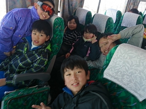 バスの中は、子どもたちがクイズで盛り上がっています。